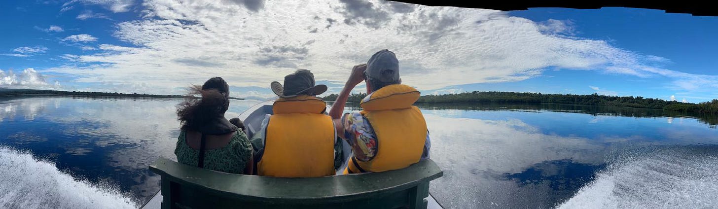 We waded onto our boat at seven, arriving back at Agnes Lodge wharf in the record time of an hour, the smooth-as-glass sea mocking us scaredy-cats as we stripped off our lifejackets and WhatsApp-ed our safe return.